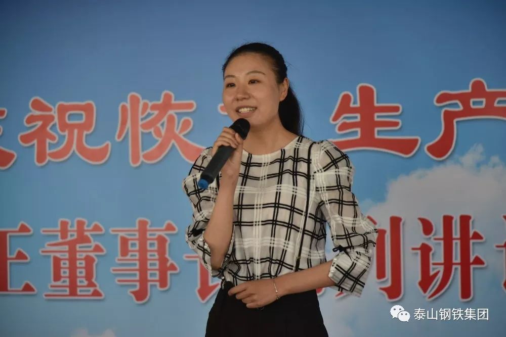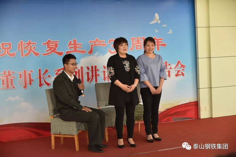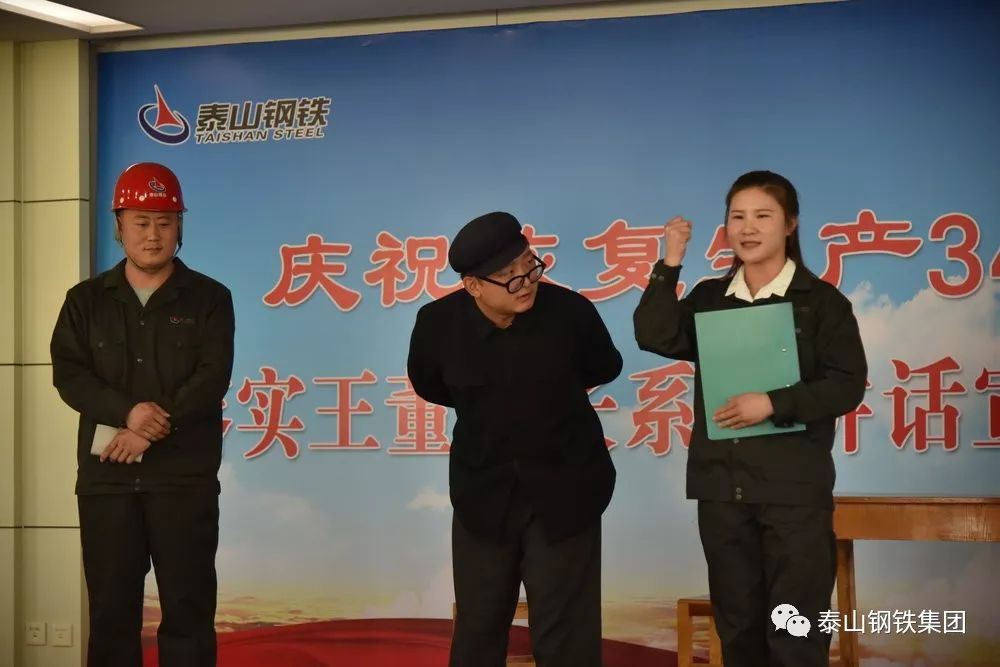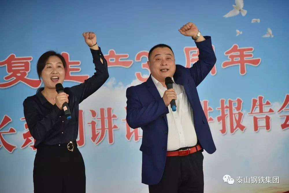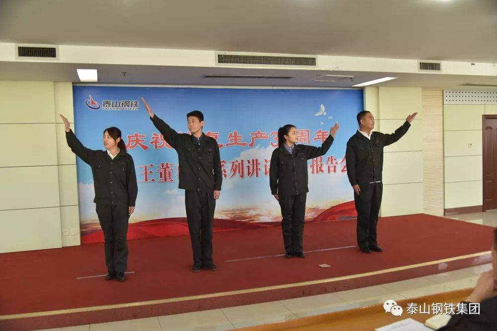 王董事长在讲话中说,今天很高兴通过宣讲报告的形式来开展活动,共同庆祝泰山钢铁集团恢复生产34周年。大家在宣讲作品中展现了很多在泰山钢铁发展中兢兢业业、爱岗奉献的老黄牛,大力弘扬了劳模精神,全面营造了劳动崇高、劳动者光荣的良好氛围,凝聚了泰山钢铁加快发展的正能量,正是有了一代一代的模范,通过一代一代的努力,才有了我们的今天。大家要积极传递这种正能量,持续推动泰山钢铁集团各项事业实现稳固发展。