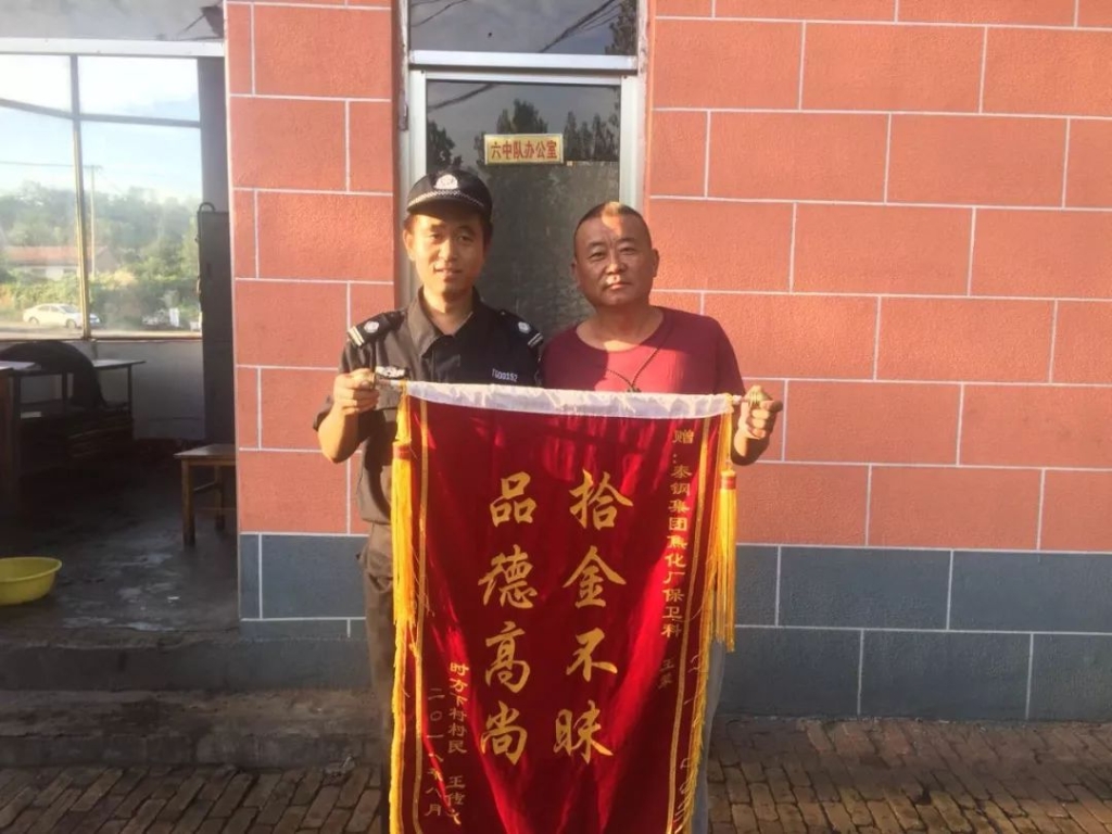 泰山钢铁的小伙子又收到锦旗啦!这是怎么回事呢?原来,在8月26日,泰山钢铁集团保卫部护卫六中队队员王蒙在下班回家途中,捡到一个女士皮包,包内有手机、现金、身份证及银行卡等物品一宗。王蒙立即通过电话联系失主,将遗失物品及时送到失主手里。失主王女士激动万分,本以为包丢了就没有再找到的希望了,没想到碰到了好心人。昨天,失主家人将一面写有“拾金不昧,品德高尚”的锦旗送到了保卫部护卫六中队,以表彰王蒙拾金不昧、乐于助人的高尚情操。