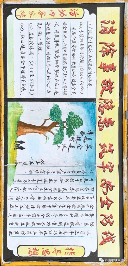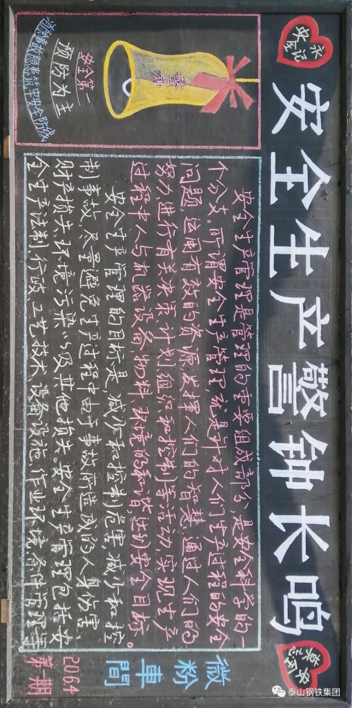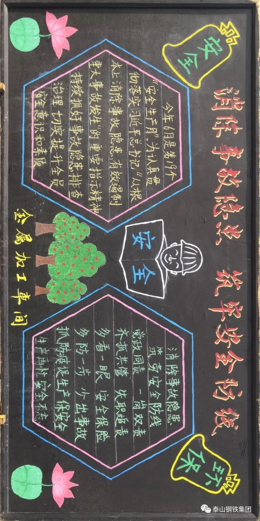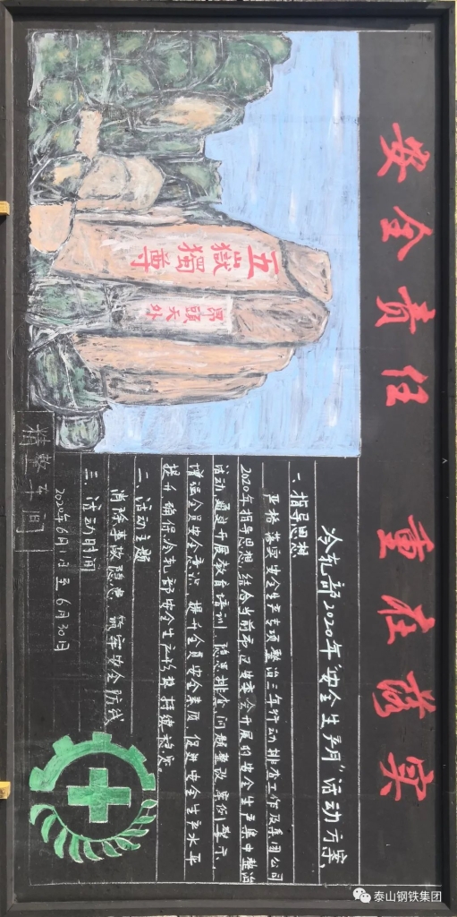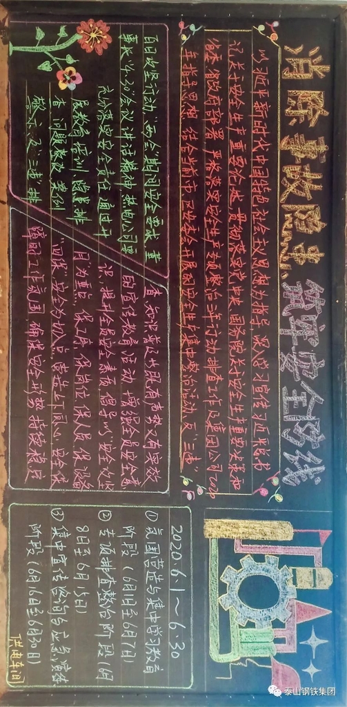 集团印发《2020年“安全生产月”活动方案》,本次“安全生产月”活动以“消除事故隐患,筑牢安全防线”为主题,按照“氛围营造与集中学习教育”“专项排查整治”“集中宣传咨询与应急演练”三个阶段开展。进入“人身安全出产月”以来,各单位积极行动,开展了黑板报展评、安全演练、安全学习教育等活动,营造了浓厚的氛围。话不多说,先让我们一起来看看部分黑板报作品吧: