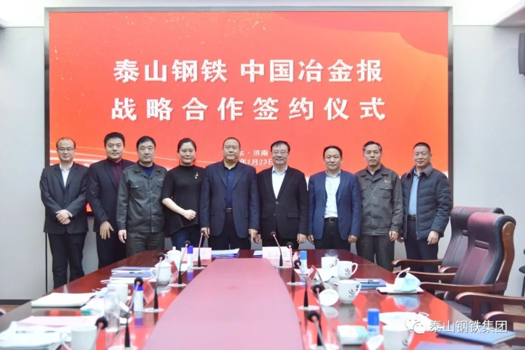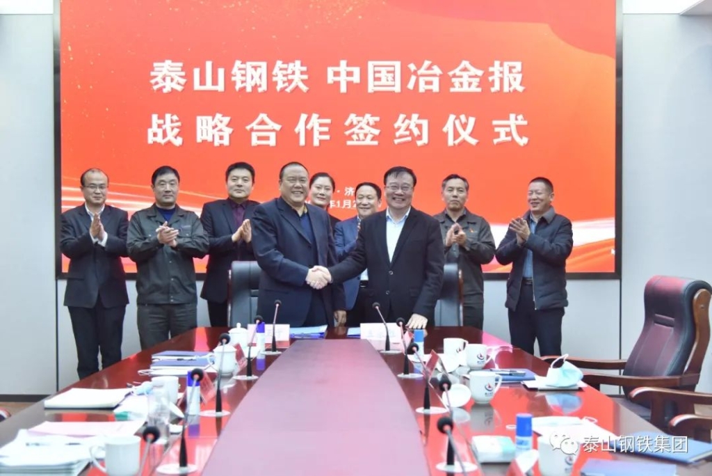 1月23日下午,泰山钢铁与中国冶金报社在泰山钢铁办公楼一楼会议室签订了战略合作协议,双方携手共同开启深化合作之路。泰山钢铁集团董事长、党委书记、总裁王永胜与中国钢铁工业协会副秘书长、中国冶金报社社长、党委书记陈玉千代表双方在合作协议书上签字。中国冶金报社社长助理、经济中心主任陈晓莉,经济中心副主任、钢铁部主任刘加军,泰山钢铁集团党委副书记、工会主席杜跃进,党委成员、总监邵书东,总监陈培敦及相关部门负责同志共同出席签约仪式。