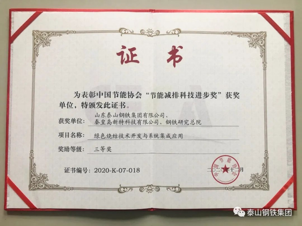 泰山钢铁集团烧结节能减排技术荣获2020年节能协会创新奖