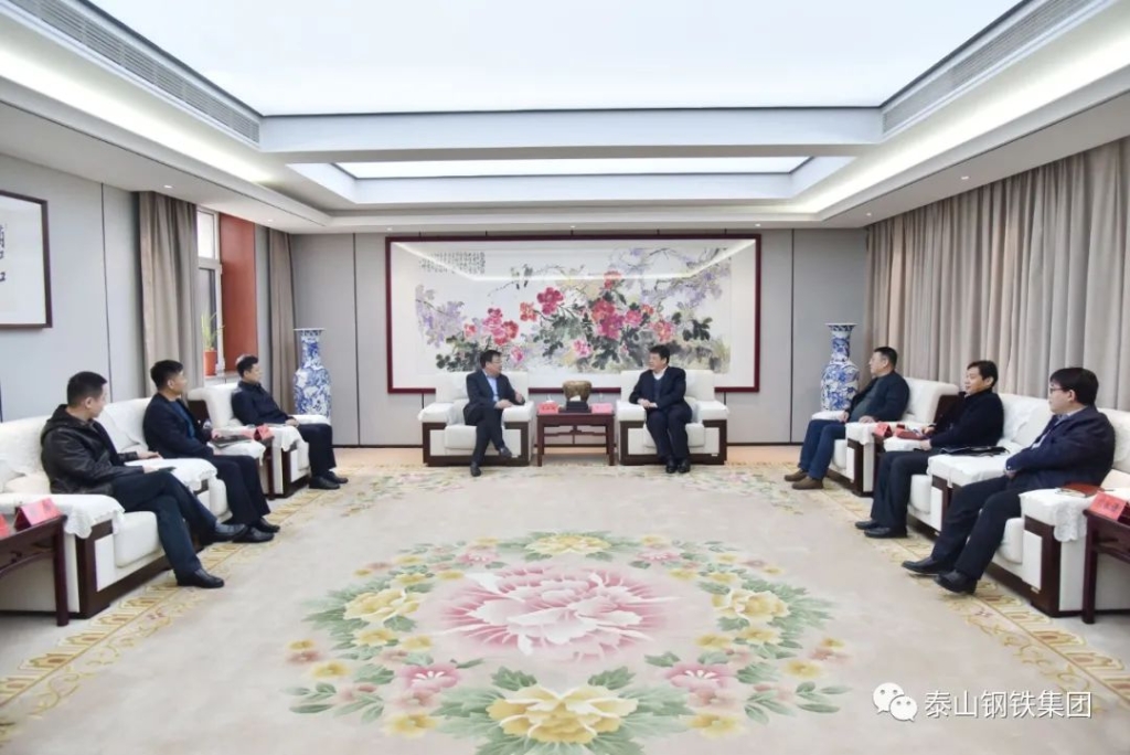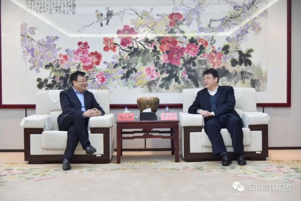 3月11日,泰山钢铁集团董事长、党委书记、总裁王永胜在办公楼贵宾室热会见五矿矿业控股有限公司总经理腰向科一行,双方交流探讨了业务合作等事项。