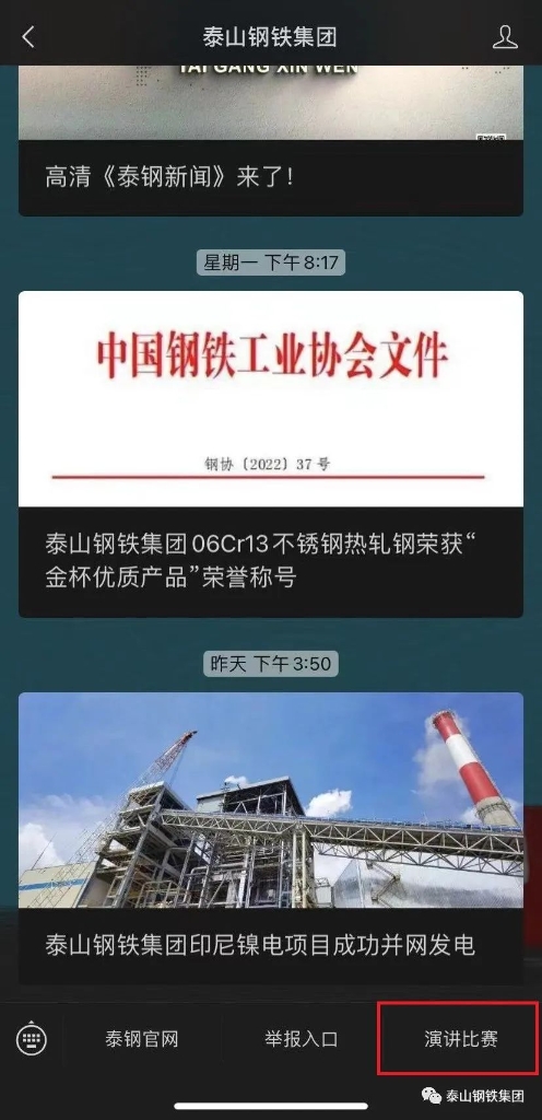 2:点一下公众号“泰山钢铁集团”界面菜单栏中的“演讲比赛”。搜索微信账号和秘码