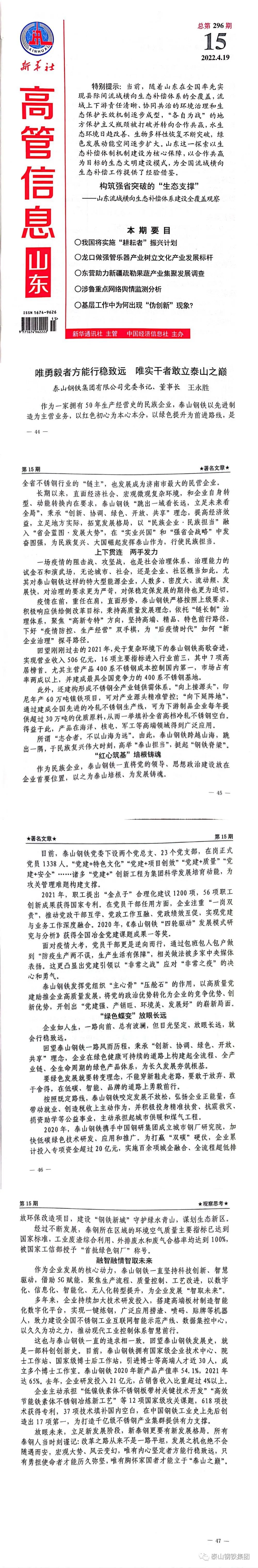 新华社《高管信息·山东》杂志2022年4月19日第15期(总第296期)刊发王董事长署名文章《唯勇毅者方能行稳致远 唯实干者敢立泰山之巅》。文章中写道,泰山钢铁“跳出一域看长远,立足未来看全局”,秉承“创新、协调、绿色、开放、共享”理念,提高经济效益,立足地方实际,拓宽发展格局,以“民族企业·民族担当”融入“省会蓝图·发展大势”,在“实业兴国”和“强省会战略”中发奋图强,为民族复兴、大国崛起发挥泰山作为,行使民族担当。