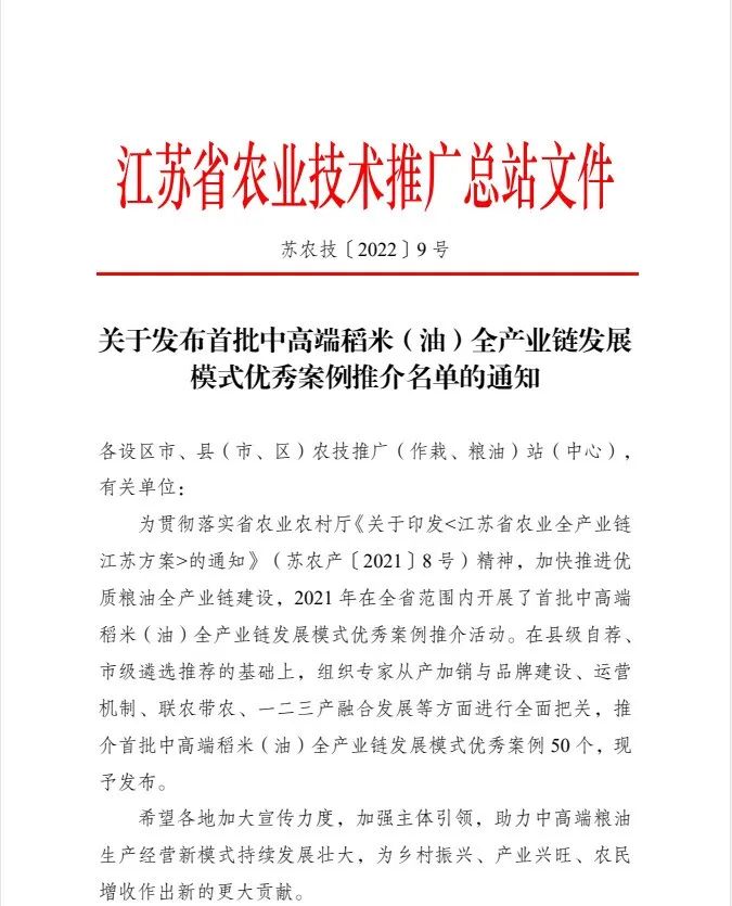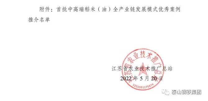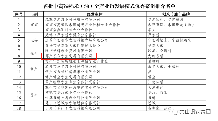 近日,江苏省首批中高端稻米(油)全产业链发展模式优秀案例推介名单公布,泰山钢铁集团邳州长勺农业发展有限公司的产品“龙虾香稻”光荣入选。