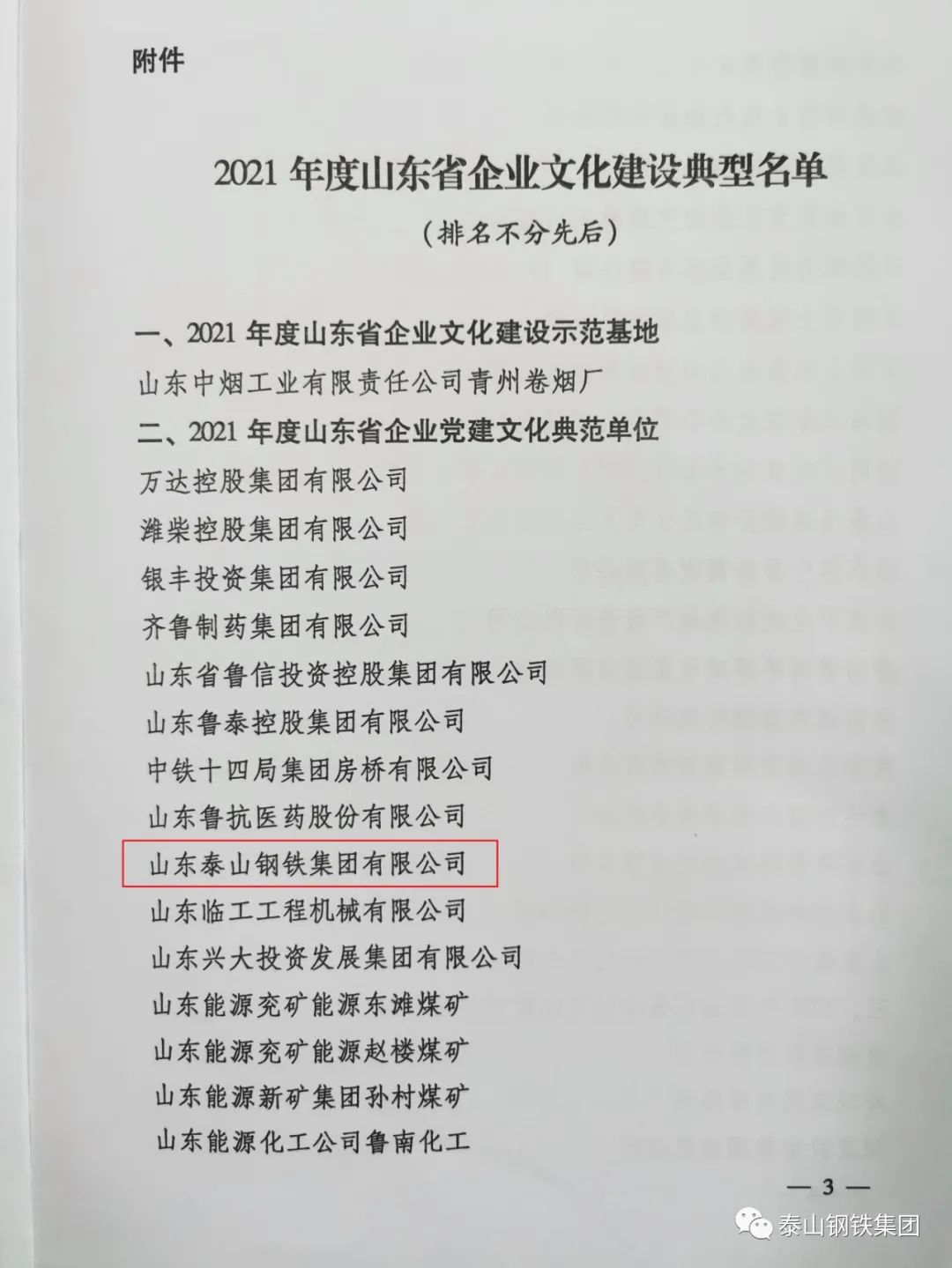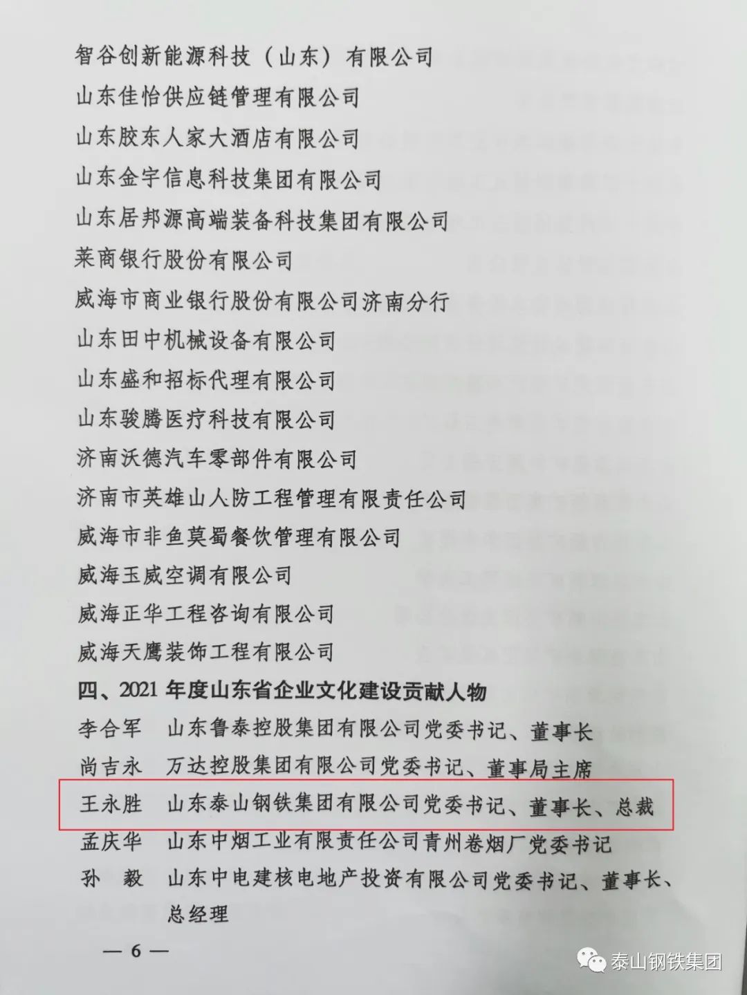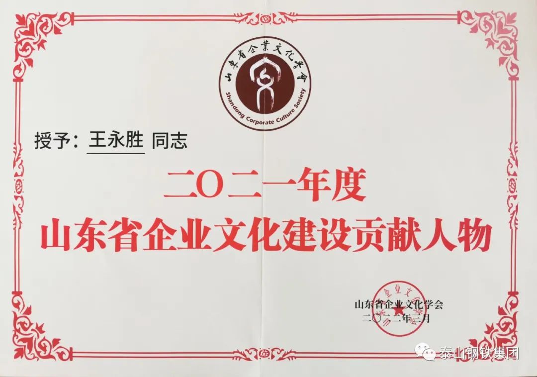 近日,山东省热博rb88体育学会下发了《关于发布2021年度山东省热博rb88体育建设典型名单的决定》文件,表彰了一批热博rb88体育建设典型单位和个人。其中,泰山钢铁集团被授予“2021年度山东省企业党建文化典范单位”荣誉称号,集团党委书记、董事长王永胜获得“2021年度山东省热博rb88体育建设贡献人物”荣誉称号。