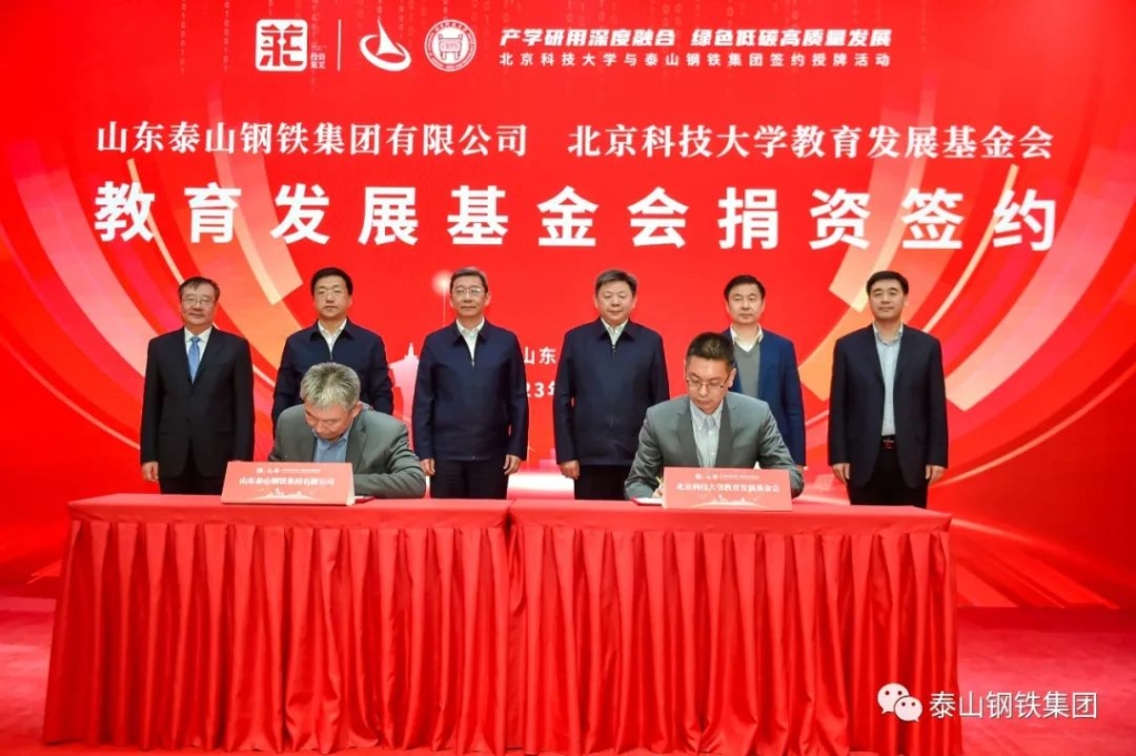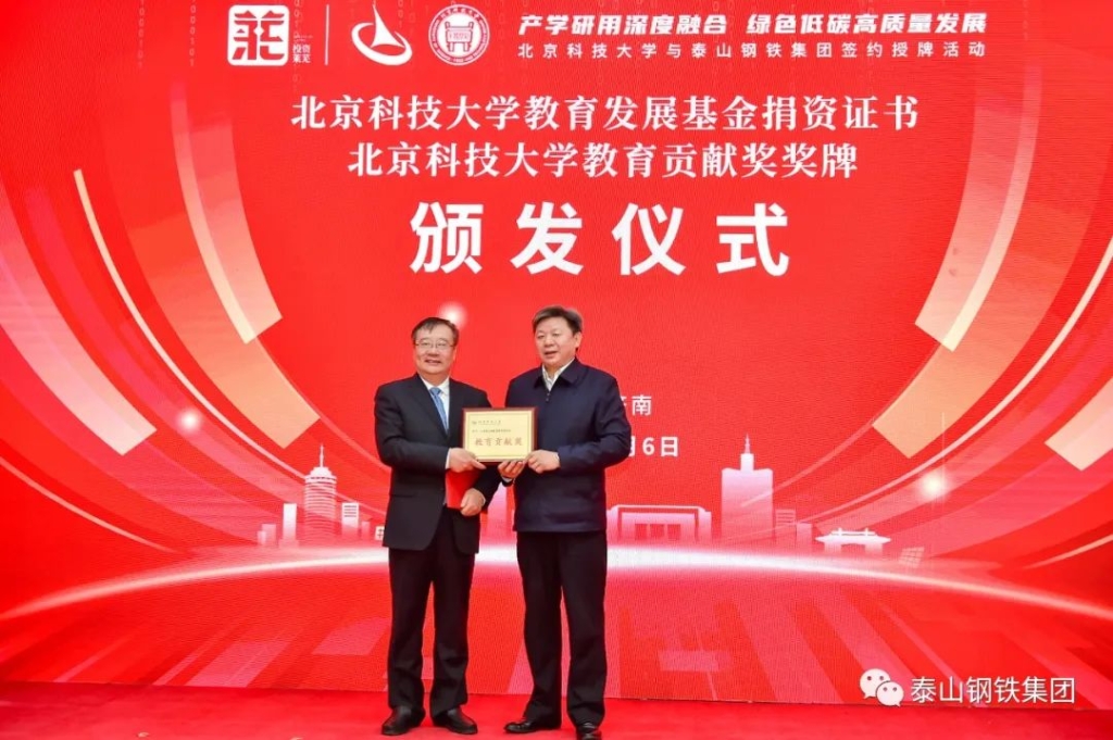 王董事长在致辞中说,泰山钢铁与北京科技大学的交流合作由来已久。多年来,北科大帮助我们在工艺路线、自动化控制等诸多方面解决了一系列难题,取得了不少突破。今天我们在这里隆重举行仪式,共建绿色低碳技术创新中心,旨在推动泰山钢铁与北科大在更宽领域、更深层次合作。在省、市加力提速工业经济高质量发展的关键节点,诚挚希望各位领导和老师关注我们,指导我们,让泰山钢铁在新时期高质量发展道路上走得更快更好,走出一条具有泰山钢铁特色的高质量发展之路。我们泰山钢铁更是要借此东风,团结奋斗向前进,争当工业战线的排头兵!