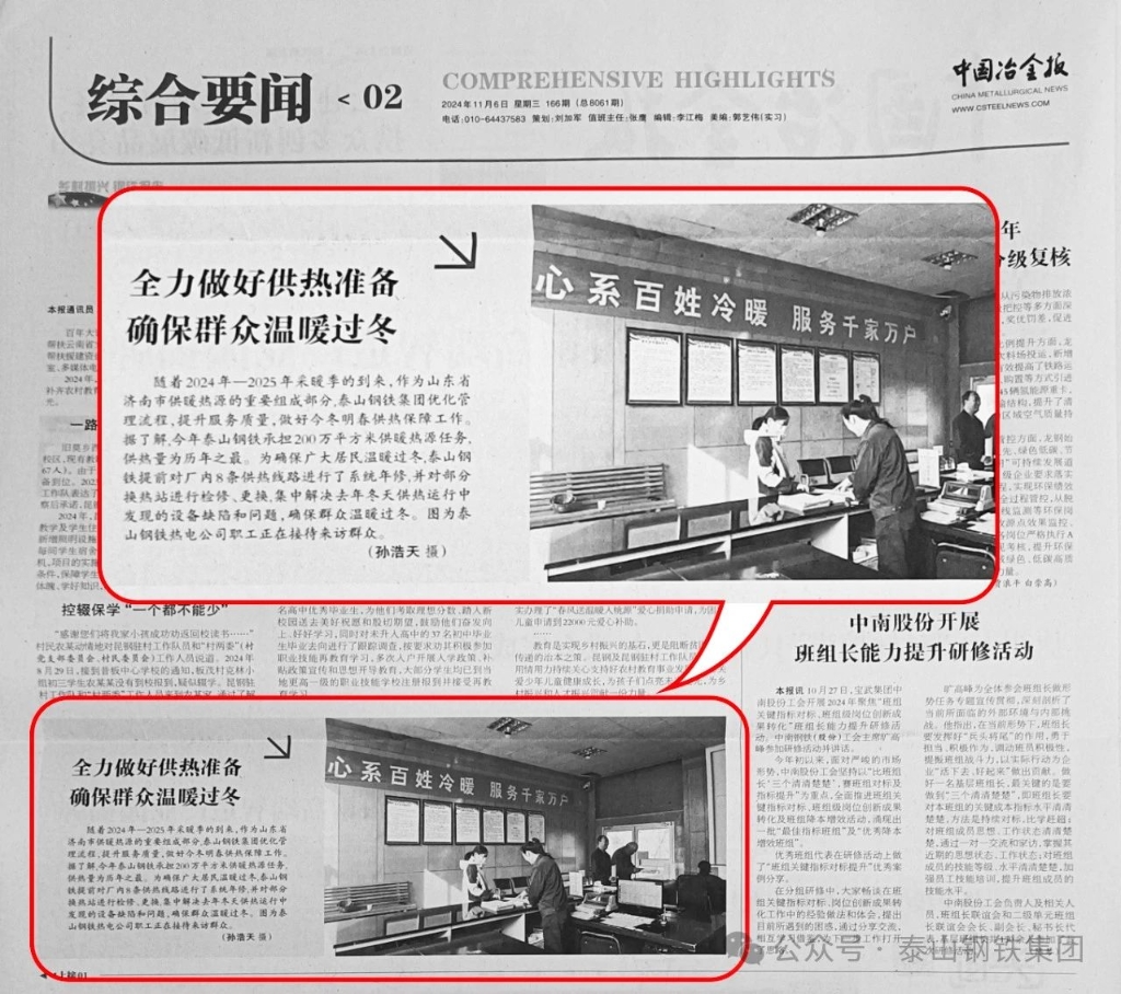 近日,泰山钢铁集团依托企业余热资源,积极承担社会责任,因地制宜探索低碳路径,把工业余热转化为绿色热动,持续提升供暖保障能力,打造产城融合“城市钢厂”的做法受到《中国冶金报》、山东卫视、齐鲁频道、闪电新闻等主流媒体的关注报道。