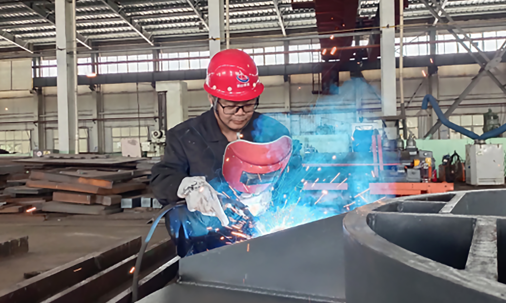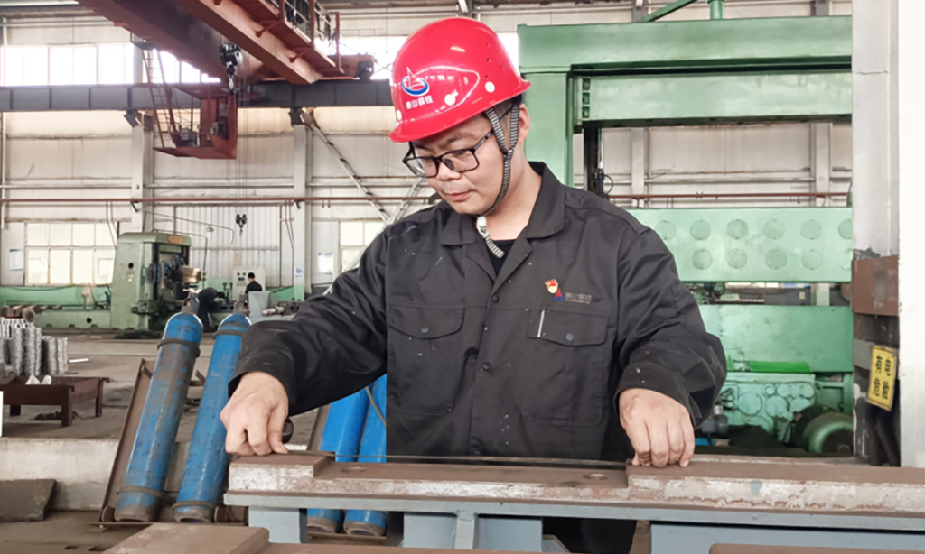 在一次设备的制作安装中,团队遇到了长轴类工件组装焊接的挑战:工件超十米,传统方法难以控制焊接变形,精度无法保障。关键时刻,张英涛站了出来。他带领团队利用多平台协作,配合油缸缸筒杆、高度尺、水准仪和百分表等工具,对毛坯件反复校准、分步定位,硬是将组装精度牢牢控制在2毫米之内。更令人称道的是,他利用厂内闲置的旧堆焊机旋转机构,自主研制出一套托轮装置,提出“旋转匀速焊接法”,实现焊枪与工件同步精准移动,不仅能有效抑制焊接变形,更保障了焊缝质量均匀可靠。